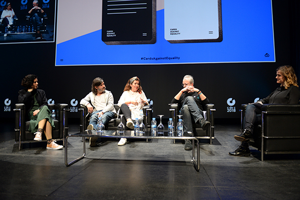 La proyección del videoclip ‘Hay mucha jefa para tan poca directora’, un trap interpretado por varias creativas para denunciar la poca presencia de mujeres creativas en puestos directivos, sirvió de introducción a un debate que, moderado por Emma Pueyo (consultora creativa), contó con la participación de Guille Viglione (Dimensión), Mónica Moro (McCann), Laura Sampedro (Wieden+Kennedy) y Chacho Puebla (Lola Mullenlowe). Un encuentro en el que la moderadora utilizó como guía una versión ad hoc, y más constructiva, de Cards Againts Humanity, el juego de cartas más vendido en Amazon: Cards Againts Equality. Siguiendo la dinámica del mismo, Emma Pueyo planteaba una pregunta con diferentes respuestas posibles para dar pie al debate entre los miembros de la mesa. Esta fueron algunas de las reflexiones que los participantes ofrecieron en el mismo sobre tres temas: escasa presencia femenina en los departamentos creativos, dificultades para la conciliación y brecha salarial.