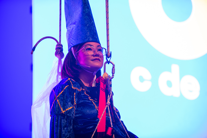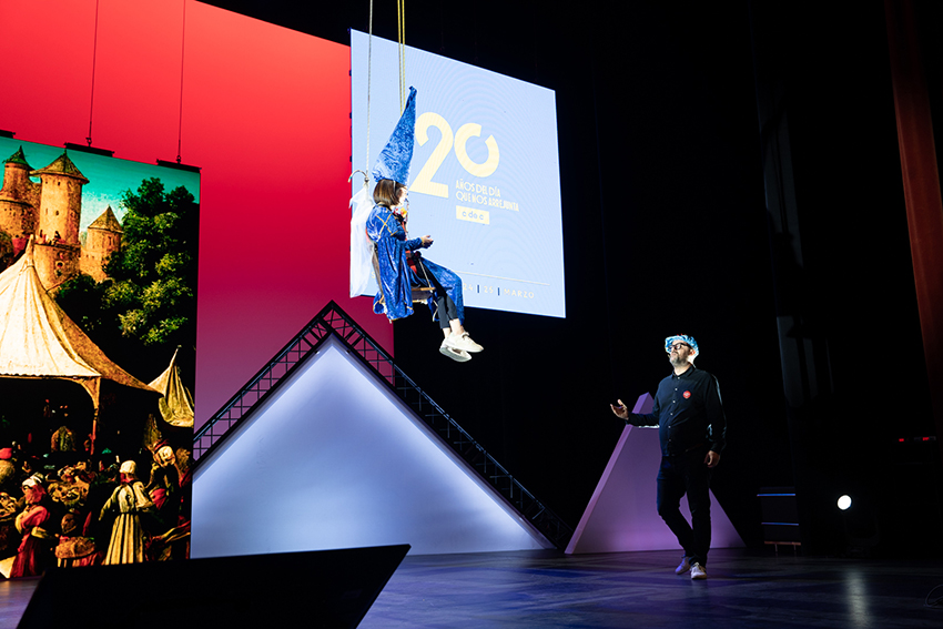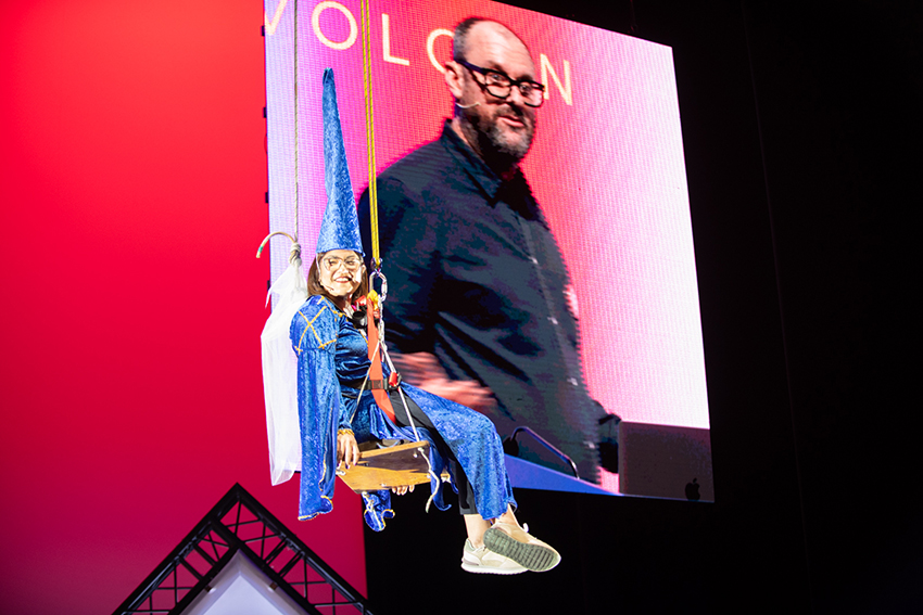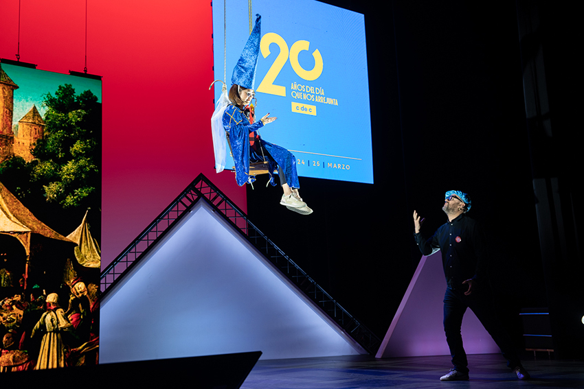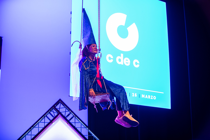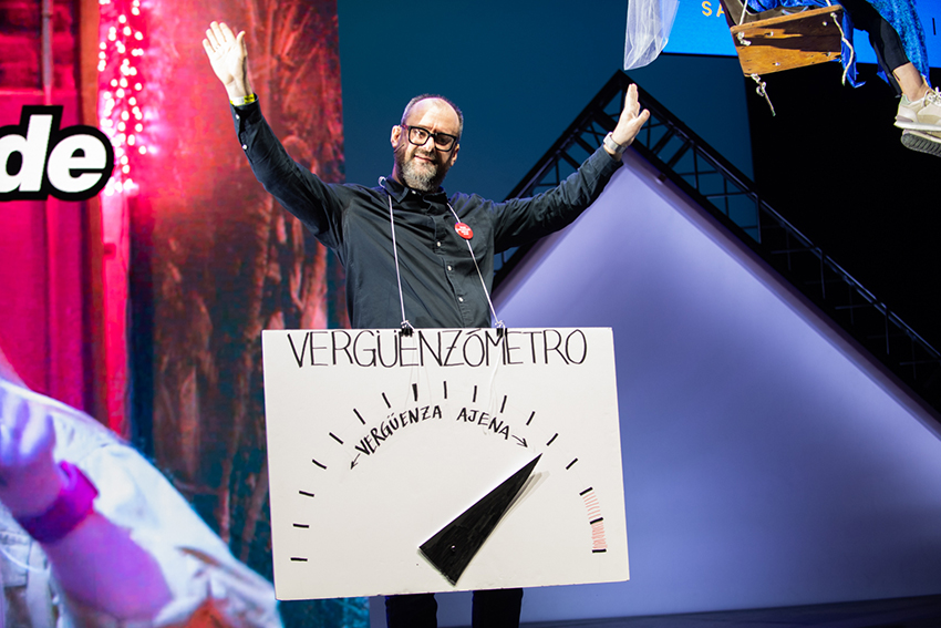 Una charla que, de la mano de su pareja Carito Kanashiro, directora de campañas en TCC Global, inició con una parodia de Romeo y Julieta (ella vestida de hada sobre un columpio colgado del techo del escenario) y finalizó con una versión adaptada al mundo publicitario del último éxito de Shakira con Bizarrap: “Una marca como yo no está pa’ truchacos, una marca como yo no está pa’ creativos como tú, copy de sangre de azul. A ti te quedé grande y por eso estás haciendo vídeos pa’ Youtube” … Pasen y vean: